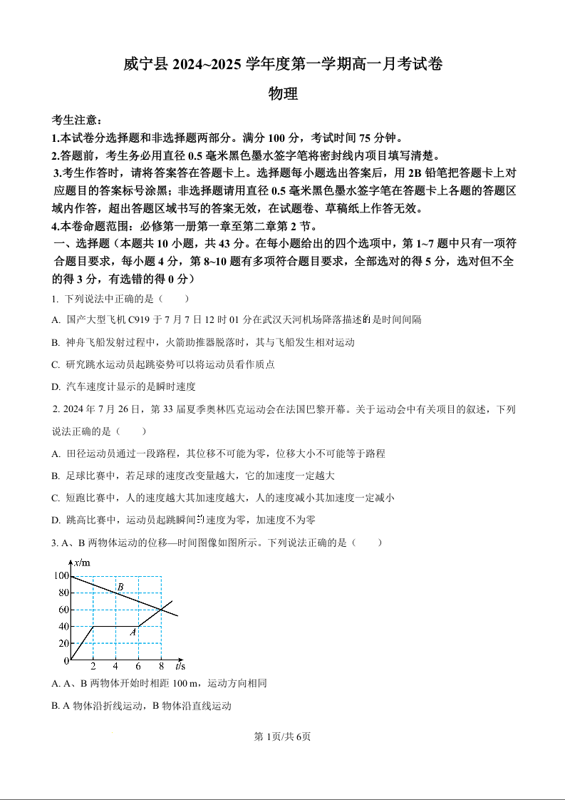 贵州省毕节市威宁县2024-2025学年高一上学期第一次月考物理(原卷版)