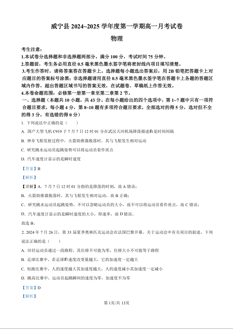 贵州省毕节市威宁县2024-2025学年高一上学期第一次月考物理(解析版)