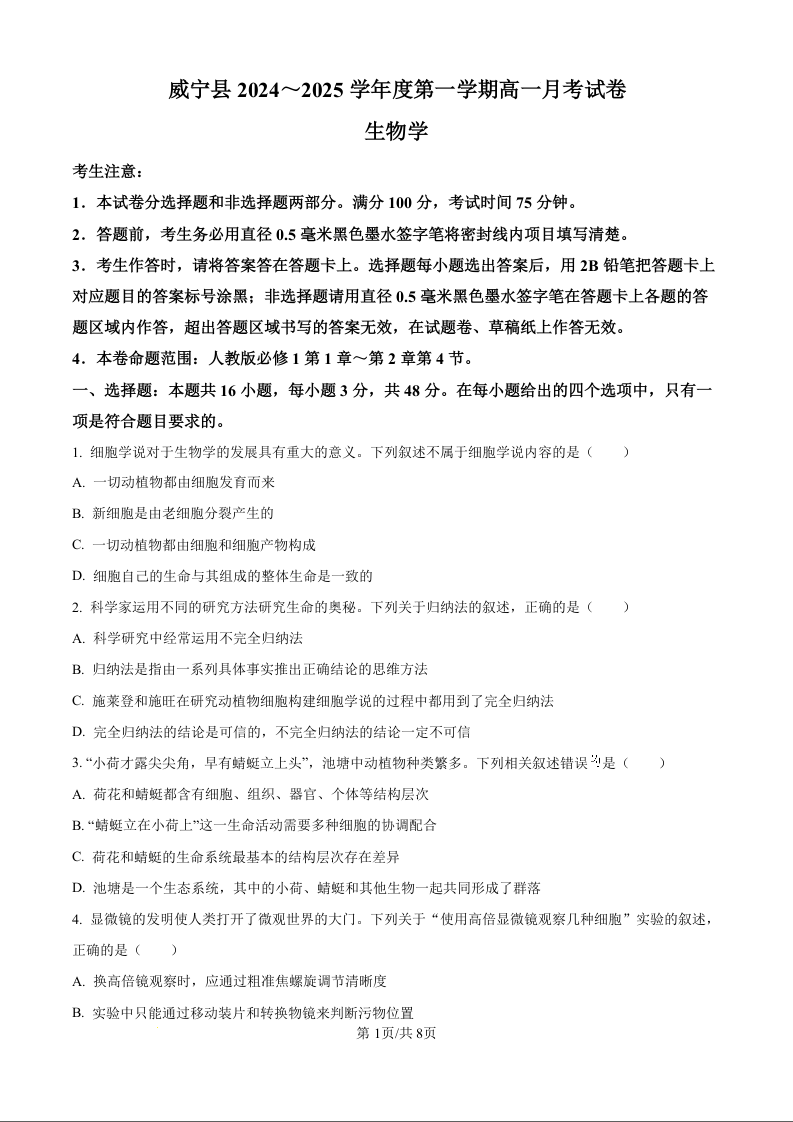 贵州省毕节市威宁县2024-2025学年高一上学期第一次月考生物(原卷版)