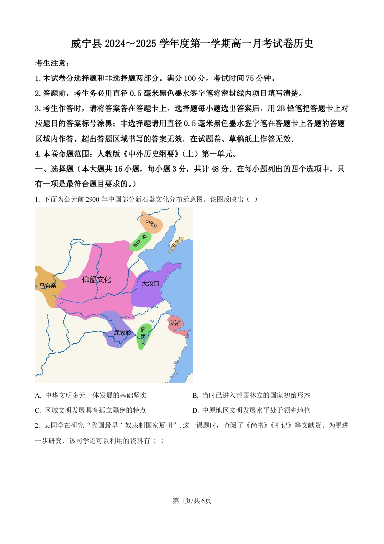 贵州省毕节市威宁县2024-2025学年高一上学期第一次月考历史(原卷版)