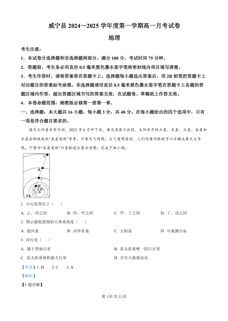 贵州省毕节市威宁县2024-2025学年高一上学期第一次月考地理(解析版)