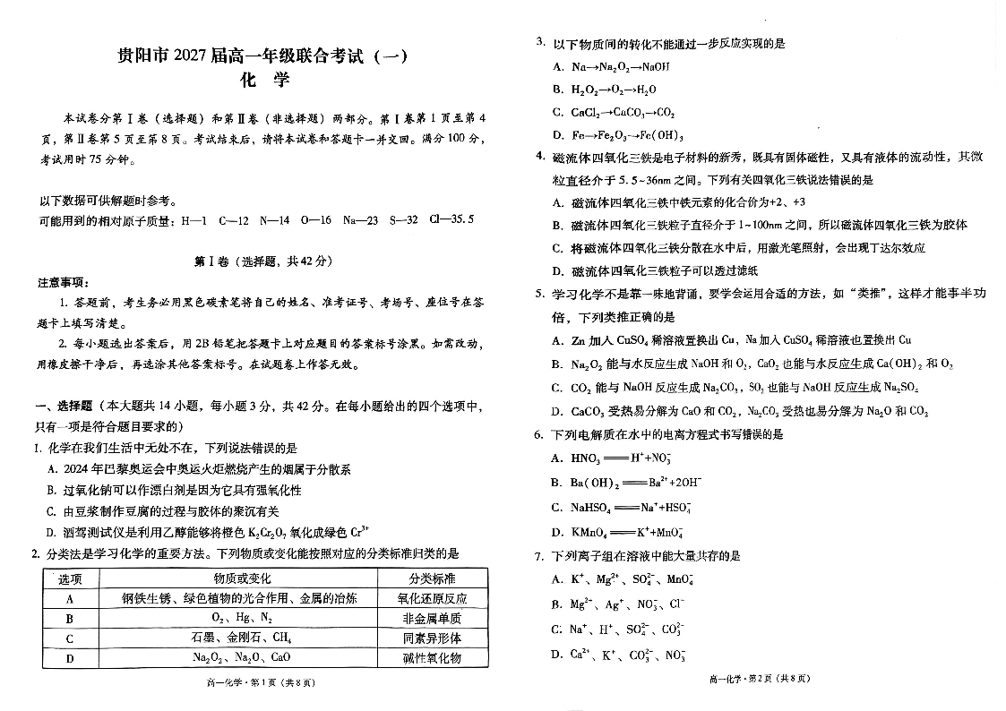 贵州省贵阳市 2027届高一年级联合考试 (一)化学+答案