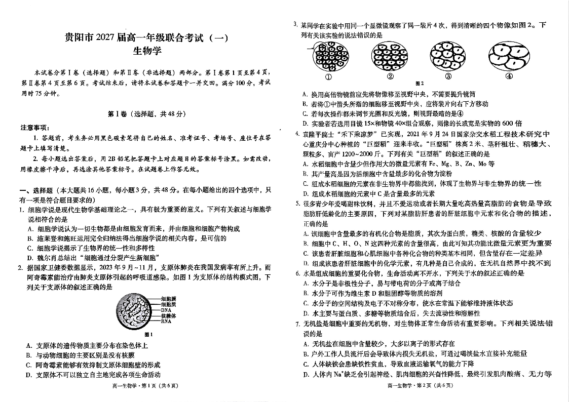 贵州省贵阳市 2027届高一年级联合考试 (一)生物+答案