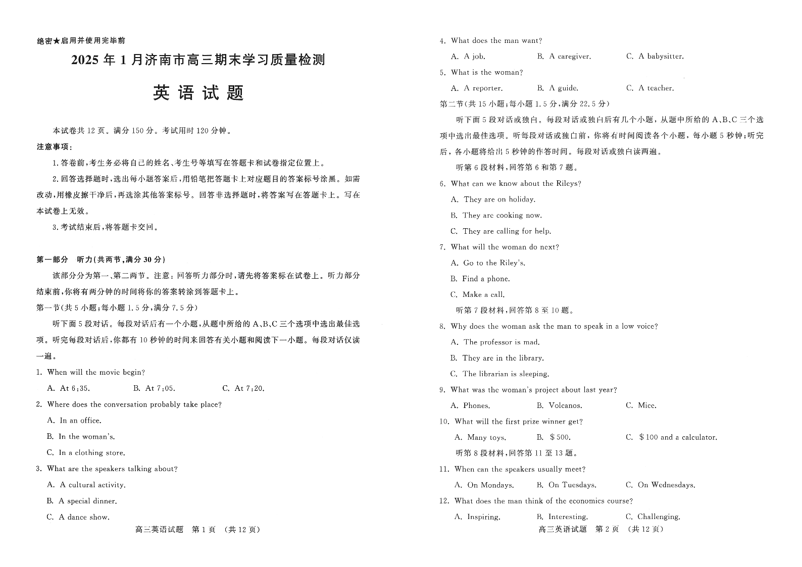 山东省济南市2024-2025学年上学期1月高三期末学习质量检测英语