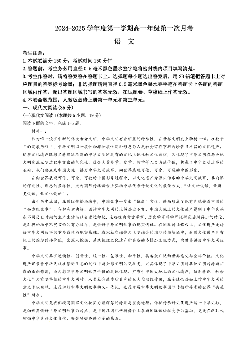 河北省沧州市2024~2025学年度第一学期高一年级第一次月考语文