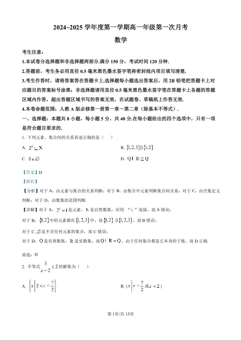 河北省沧州市2024~2025学年度第一学期高一年级第一次月考数学(解析版)