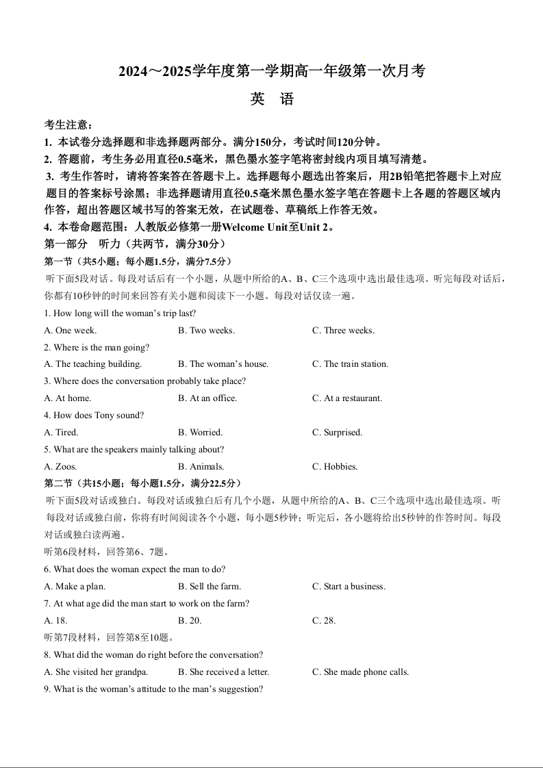 河北省沧州市2024~2025学年度第一学期高一年级第一次月考英语+答案