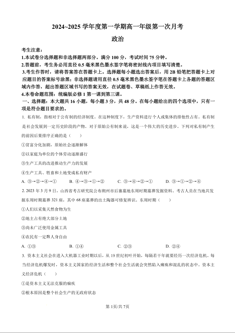 河北省沧州市2024~2025学年度第一学期高一年级第一次月考政治(原卷版)