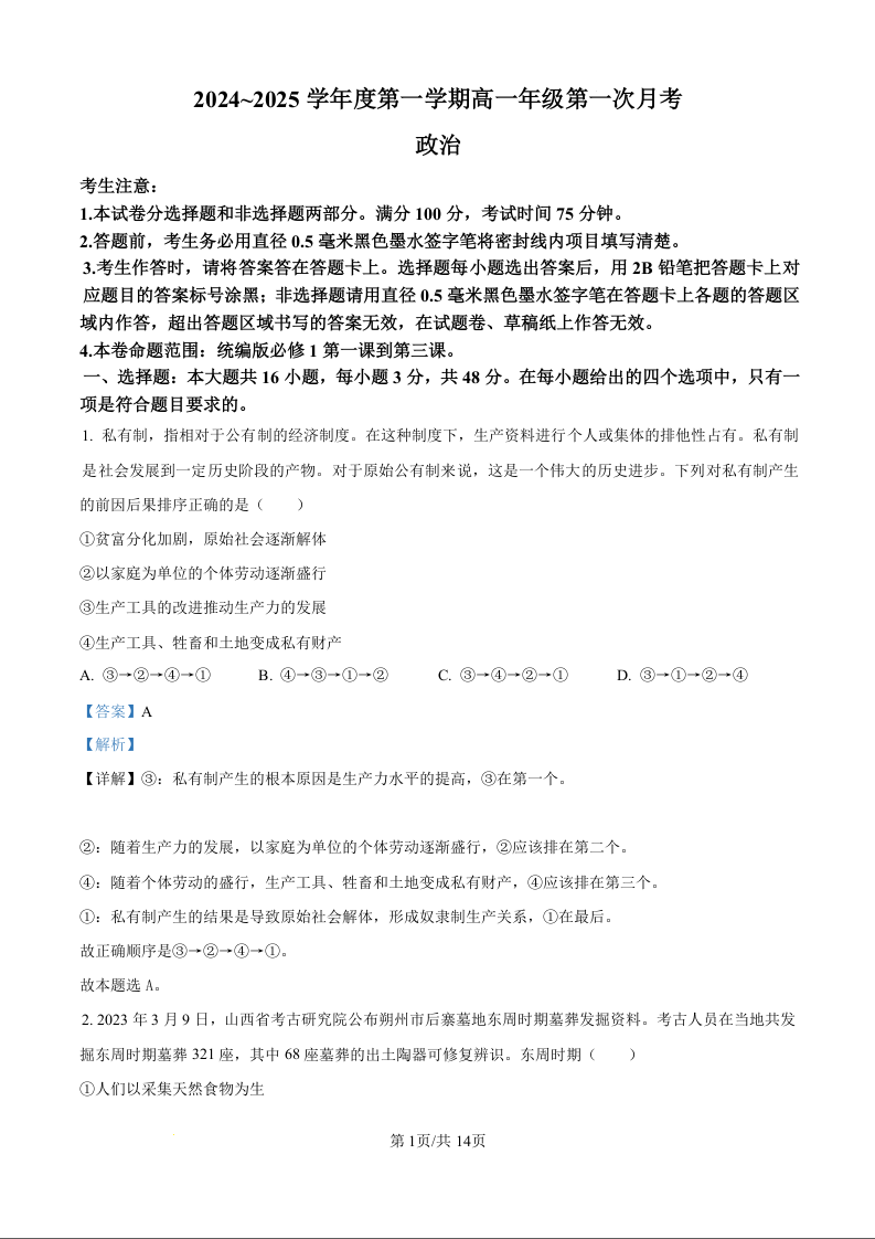 河北省沧州市2024~2025学年度第一学期高一年级第一次月考政治(解析版)