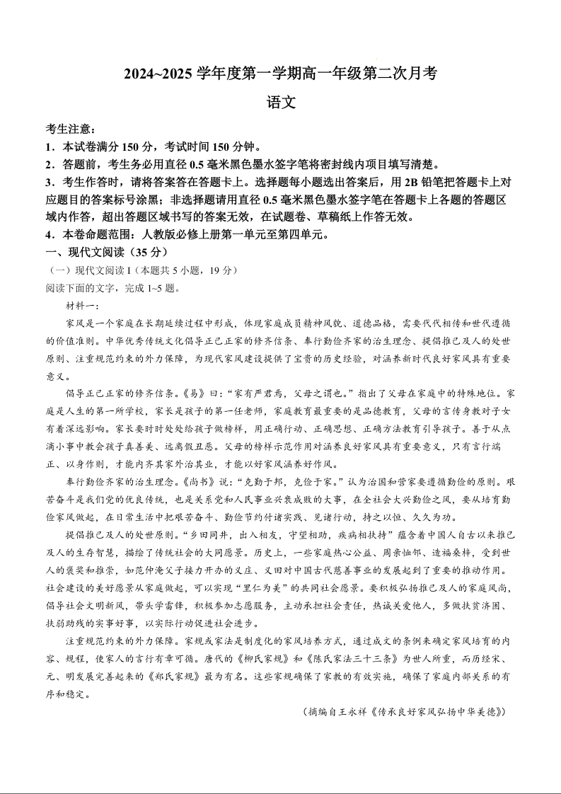 河北省沧州市四县联考2024∼2025学年度第一学期高一年级第二次月考语文+答案