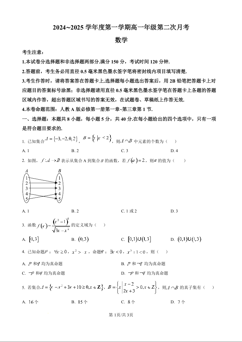 河北省沧州市四县联考2024∼2025学年度第一学期高一年级第二次月考数学(原卷版)