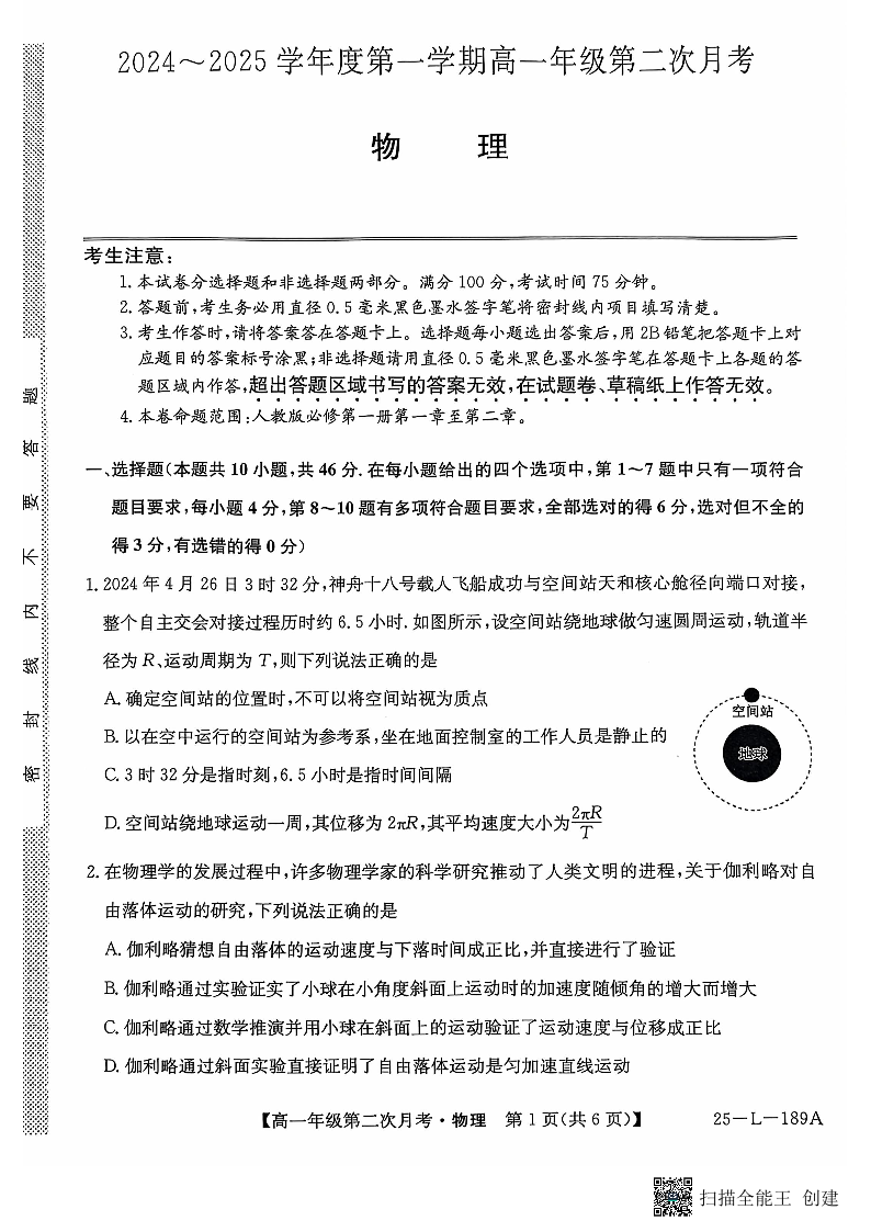 河北省沧州市四县联考2024∼2025学年度第一学期高一年级第二次月考物理
