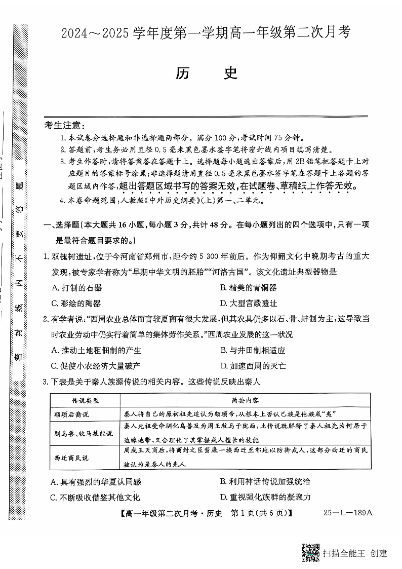 河北省沧州市四县联考2024∼2025学年度第一学期高一年级第二次月考历史