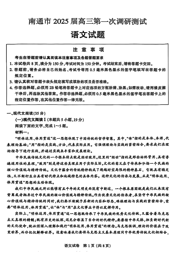 江苏省南通市、泰州市、镇江市、盐城市2025届高三第一次调研测试语文