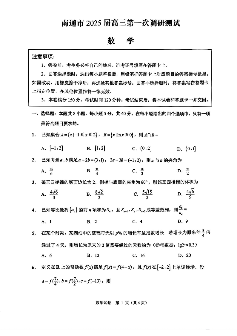 江苏省南通市、泰州市、镇江市、盐城市2025届高三第一次调研测试数学