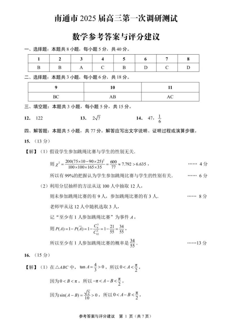 江苏省南通市、泰州市、镇江市、盐城市2025届高三第一次调研测试数学答案