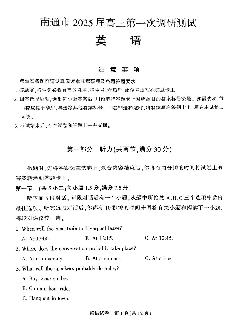 江苏省南通市、泰州市、镇江市、盐城市2025届高三第一次调研测试英语