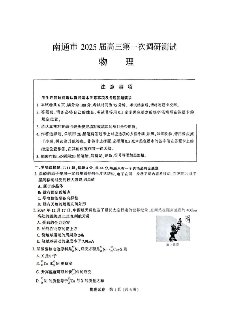 江苏省南通市、泰州市、镇江市、盐城市2025届高三第一次调研测试物理