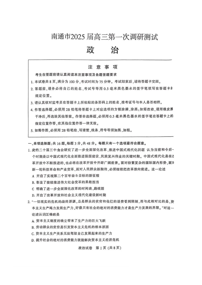 江苏省南通市、泰州市、镇江市、盐城市2025届高三第一次调研测试政治
