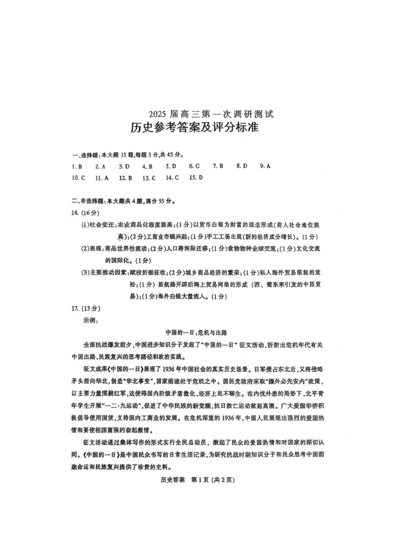 江苏省南通市、泰州市、镇江市、盐城市2025届高三第一次调研测试历史答案