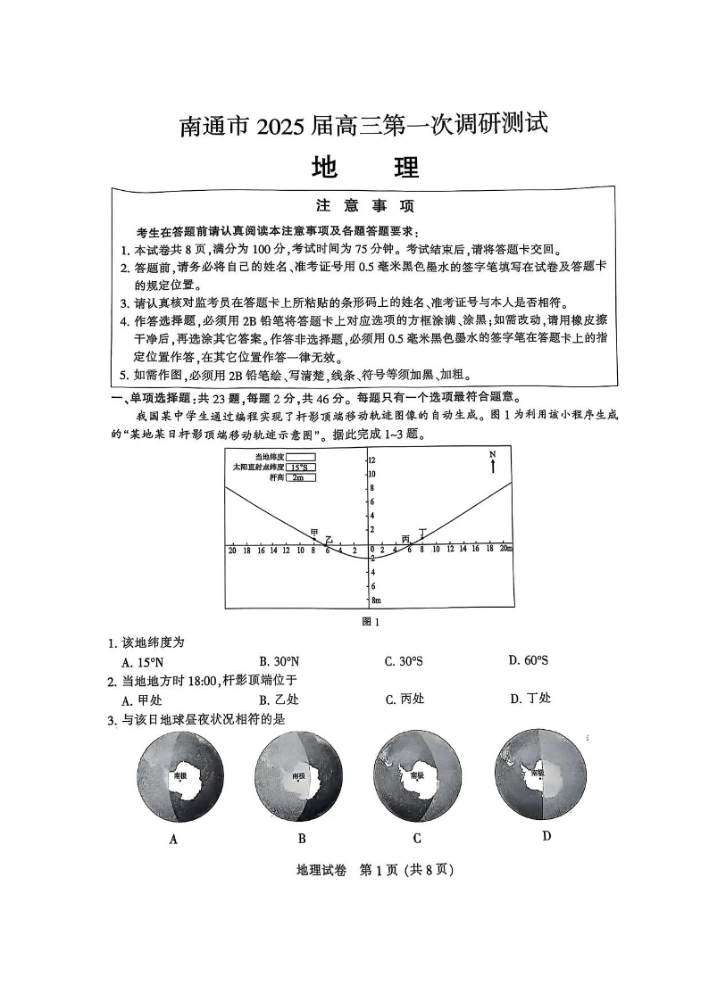 江苏省南通市、泰州市、镇江市、盐城市2025届高三第一次调研测试地理