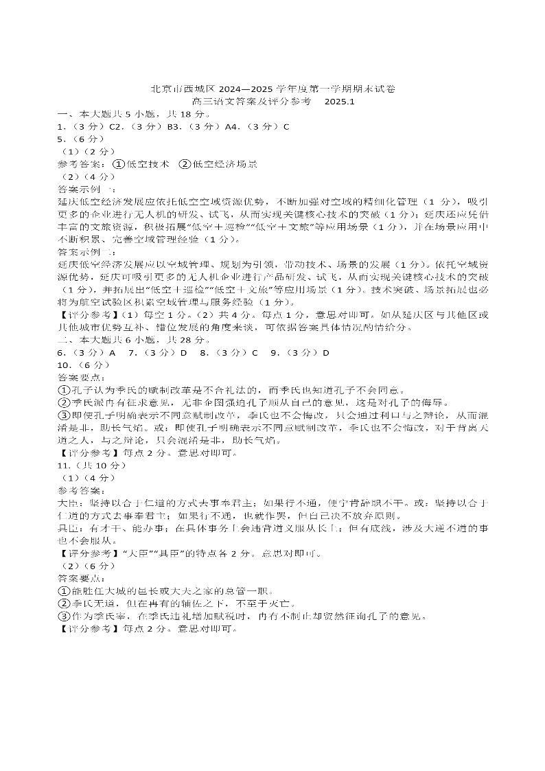 北京市西城区2024-2025学年第一学期高三期末考试语文答案