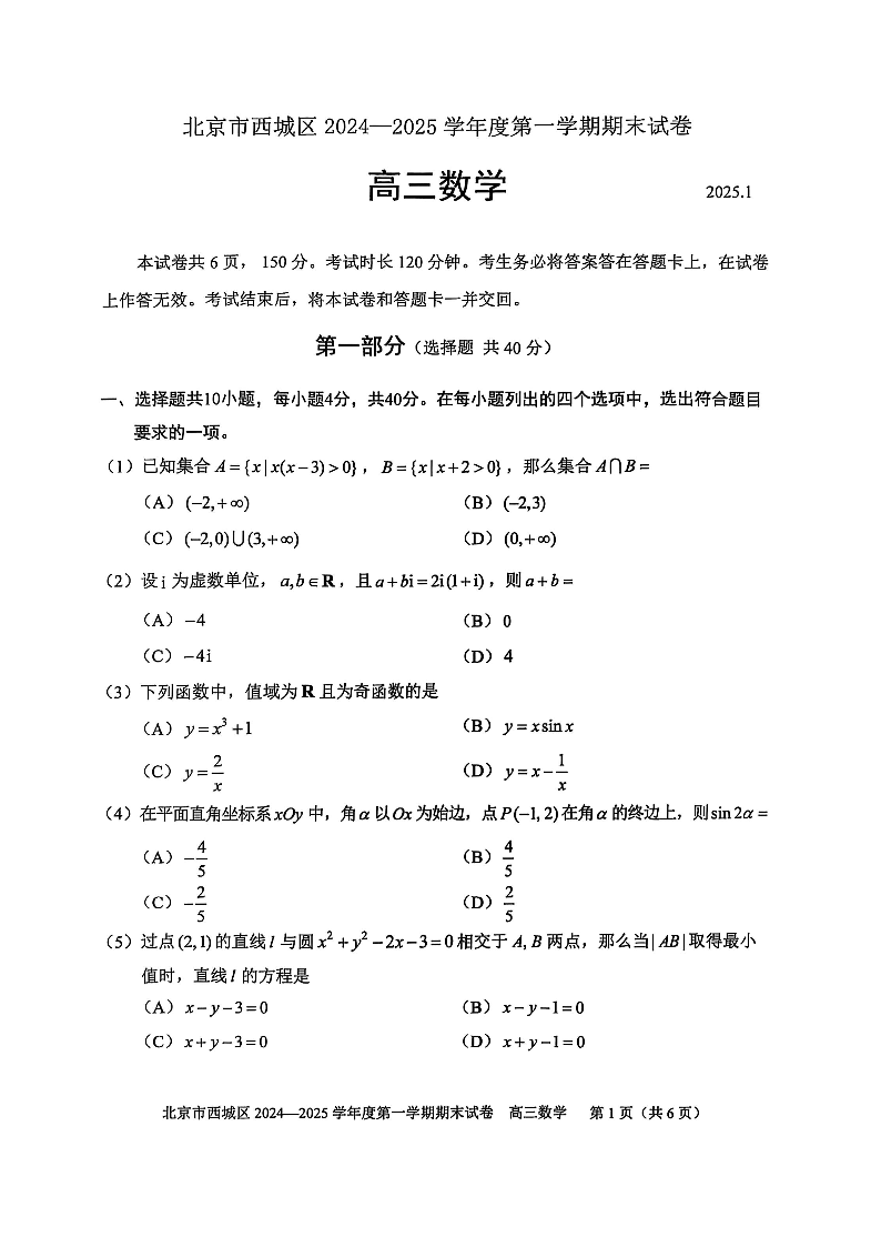北京市西城区2024-2025学年第一学期高三期末考试数学+答案
