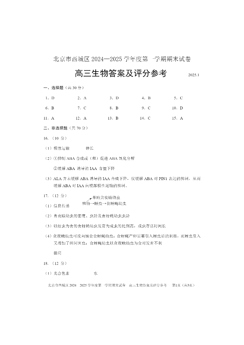 北京市西城区2024-2025学年第一学期高三期末考试生物答案