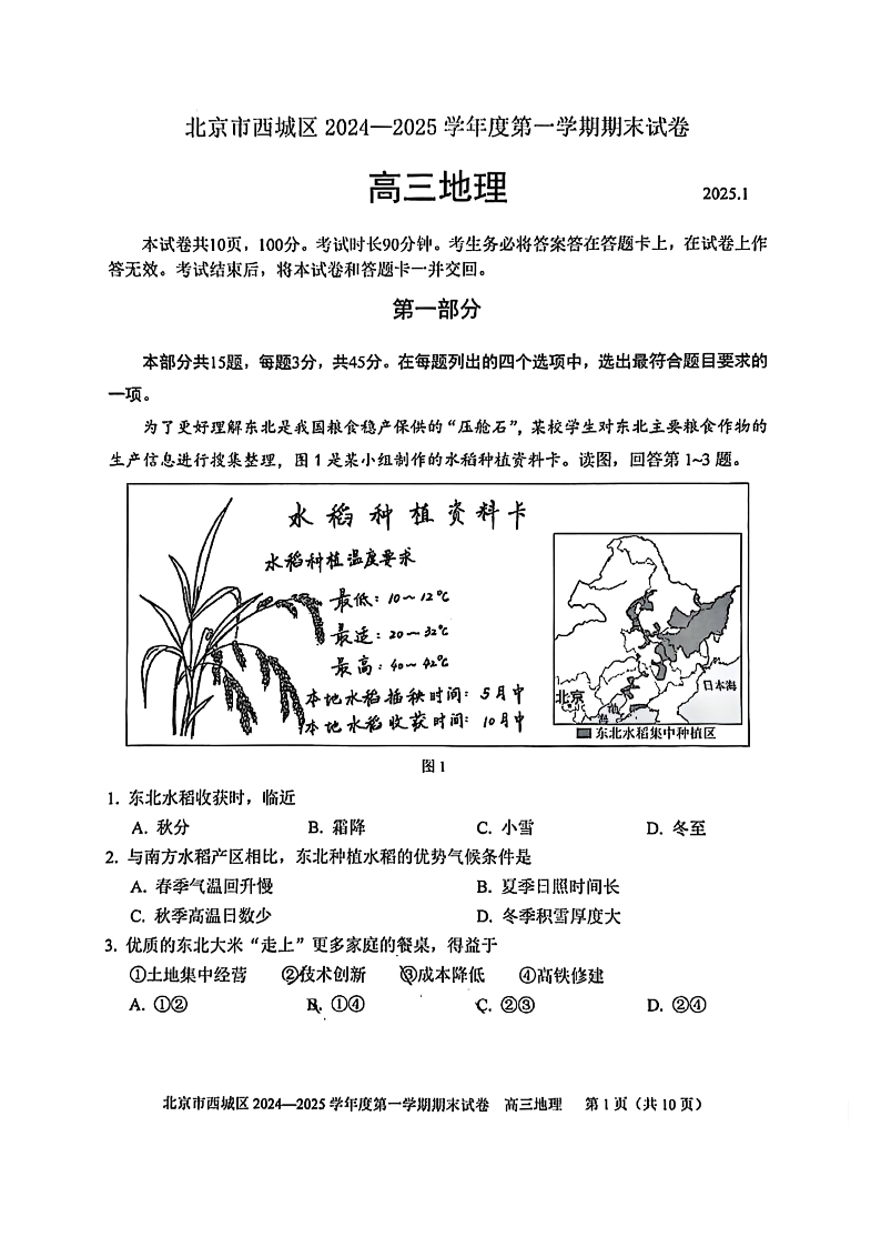 北京市西城区2024-2025学年第一学期高三期末考试地理+答案