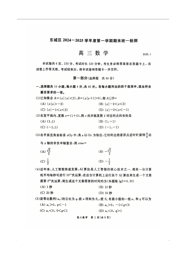 北京市东城区2024-2025学年第一学期高三期末统一检测数学