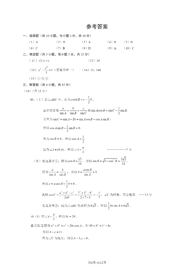 北京市东城区2024-2025学年第一学期高三期末统一检测数学答案