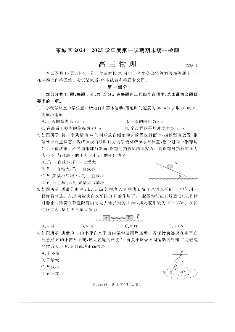 北京市东城区2024-2025学年第一学期高三期末统一检测物理+答案