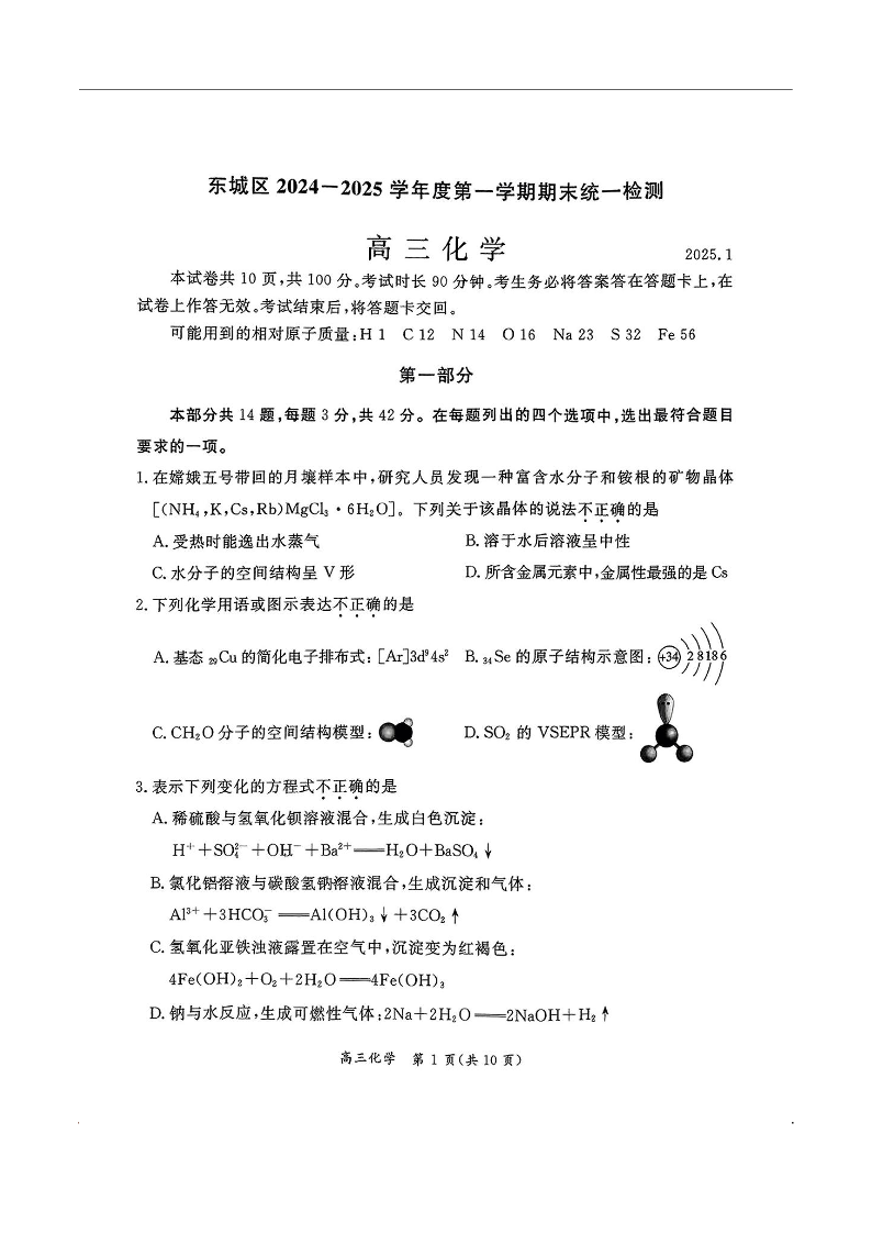 北京市东城区2024-2025学年第一学期高三期末统一检测化学