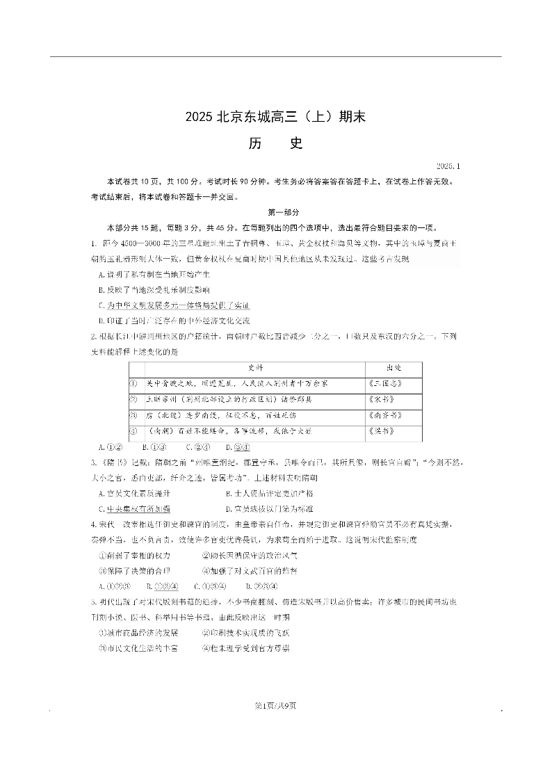 北京市东城区2024-2025学年第一学期高三期末统一检测历史+答案