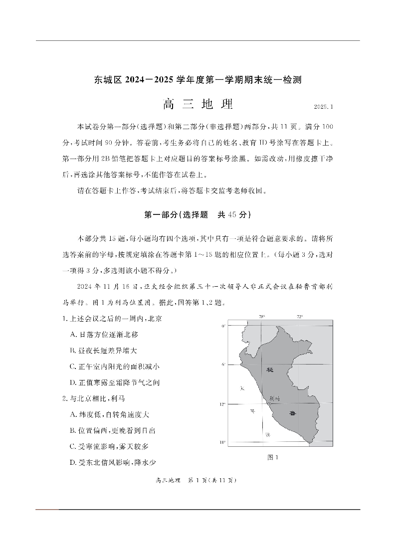 北京市东城区2024-2025学年第一学期高三期末统一检测地理+答案