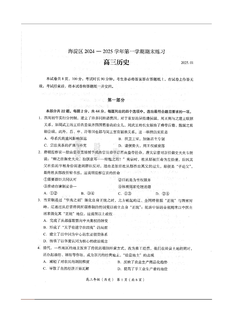 北京市海淀区2024-2025学年第一学期高三期末考试历史