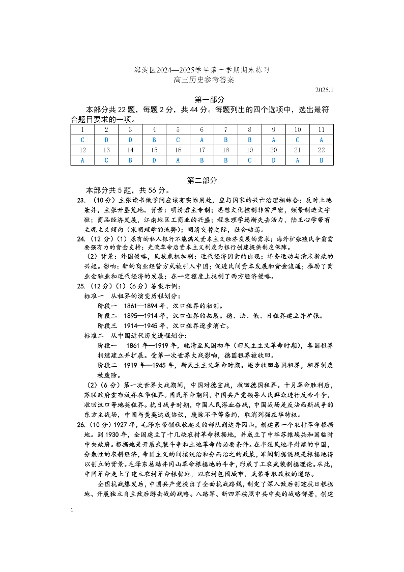 北京市海淀区2024-2025学年第一学期高三期末考试历史答案