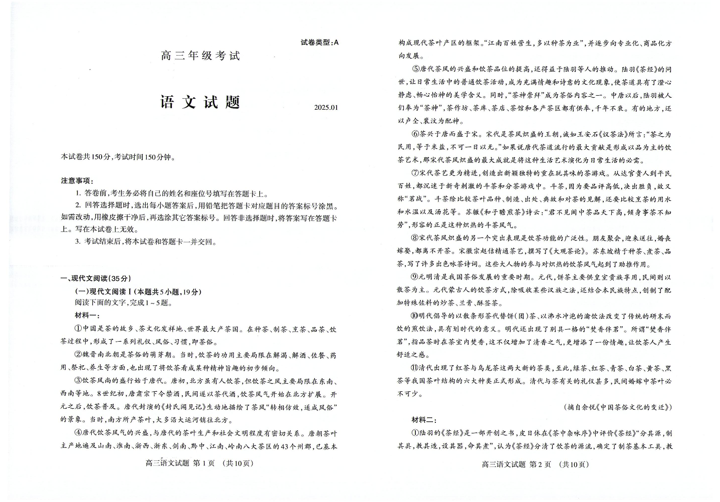 山东省泰安市2024-2025学年上学期1月高三期末考试语文