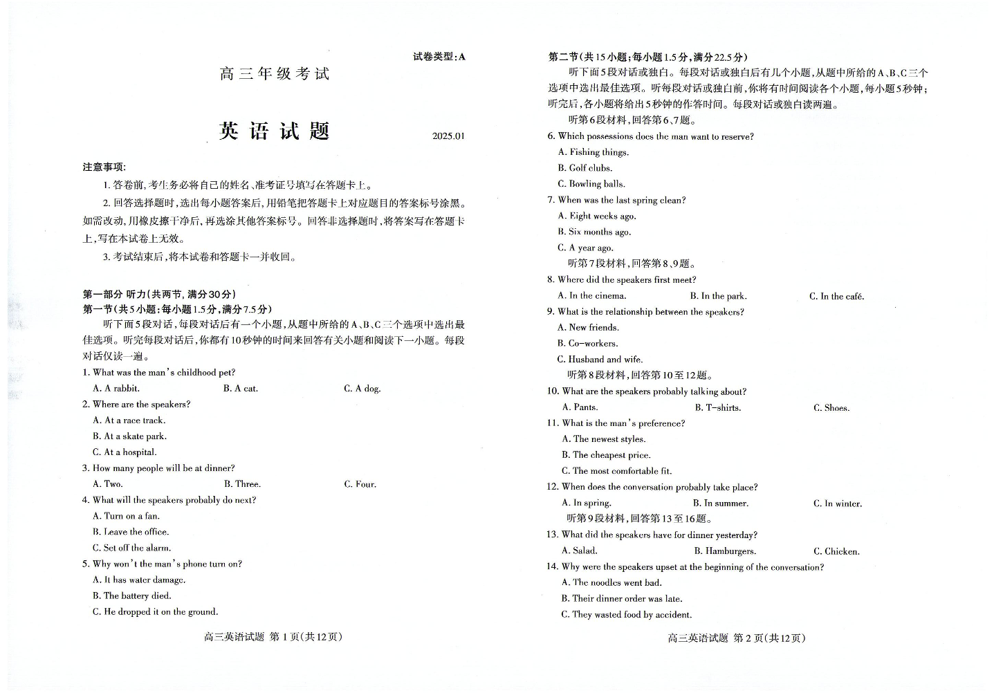山东省泰安市2024-2025学年上学期1月高三期末考试英语