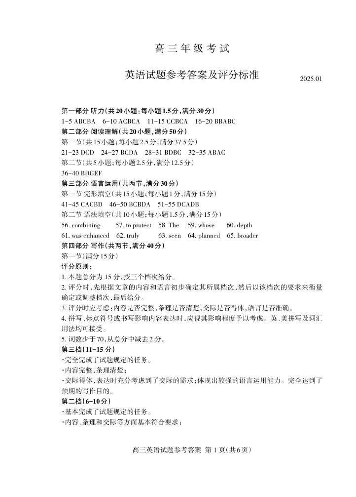 山东省泰安市2024-2025学年上学期1月高三期末考试英语答案
