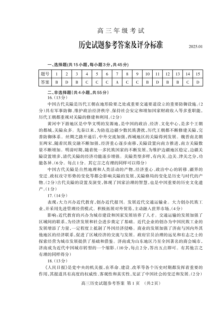 山东省泰安市2024-2025学年上学期1月高三期末考试历史答案