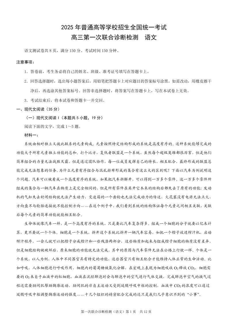 重庆市康德卷2024-2025学年上期高三第一次联合诊断(重庆一诊)语文