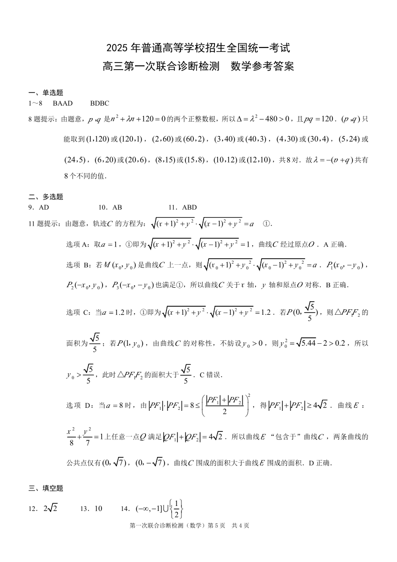 重庆市康德卷2024-2025学年上期高三第一次联合诊断(重庆一诊)数学答案
