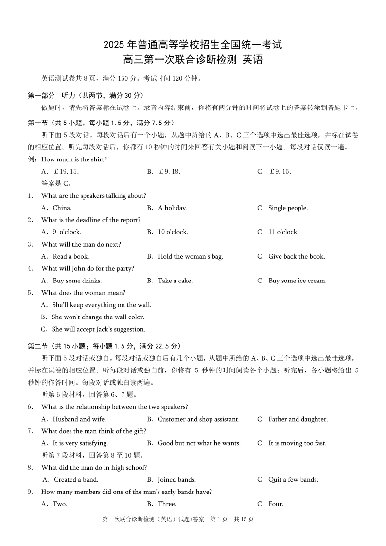 重庆市康德卷2024-2025学年上期高三第一次联合诊断(重庆一诊)英语