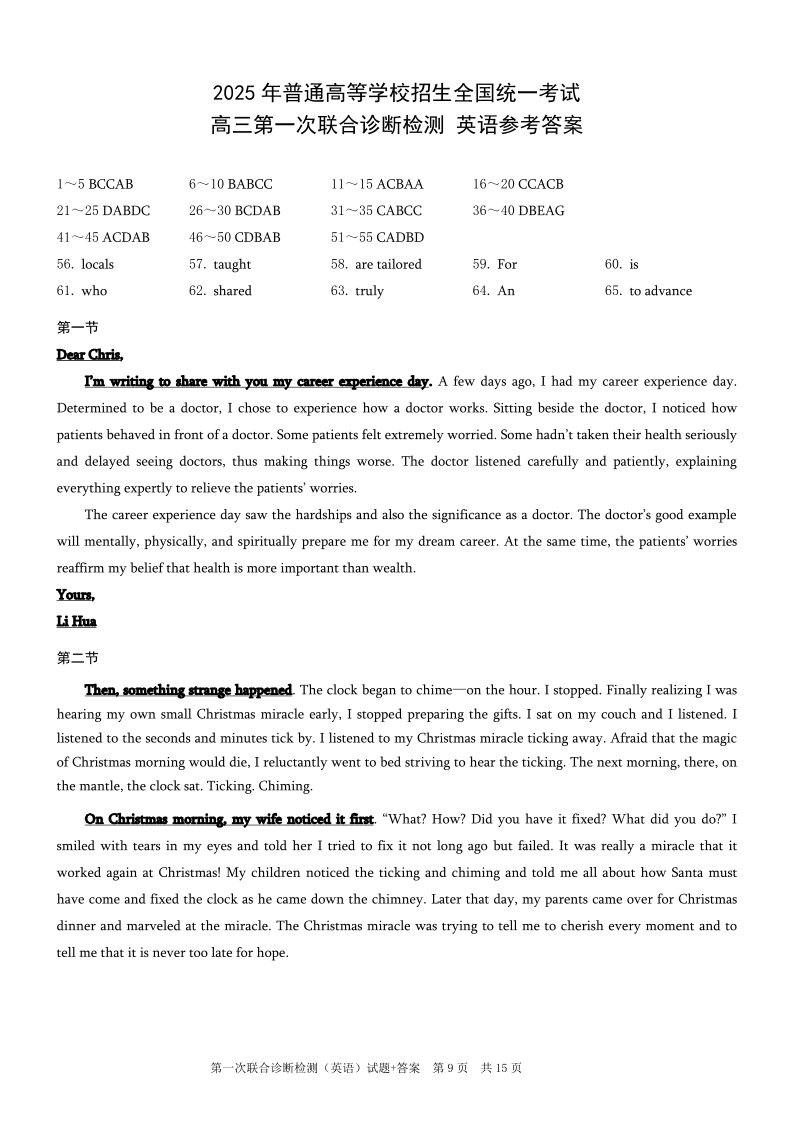 重庆市康德卷2024-2025学年上期高三第一次联合诊断(重庆一诊)英语答案