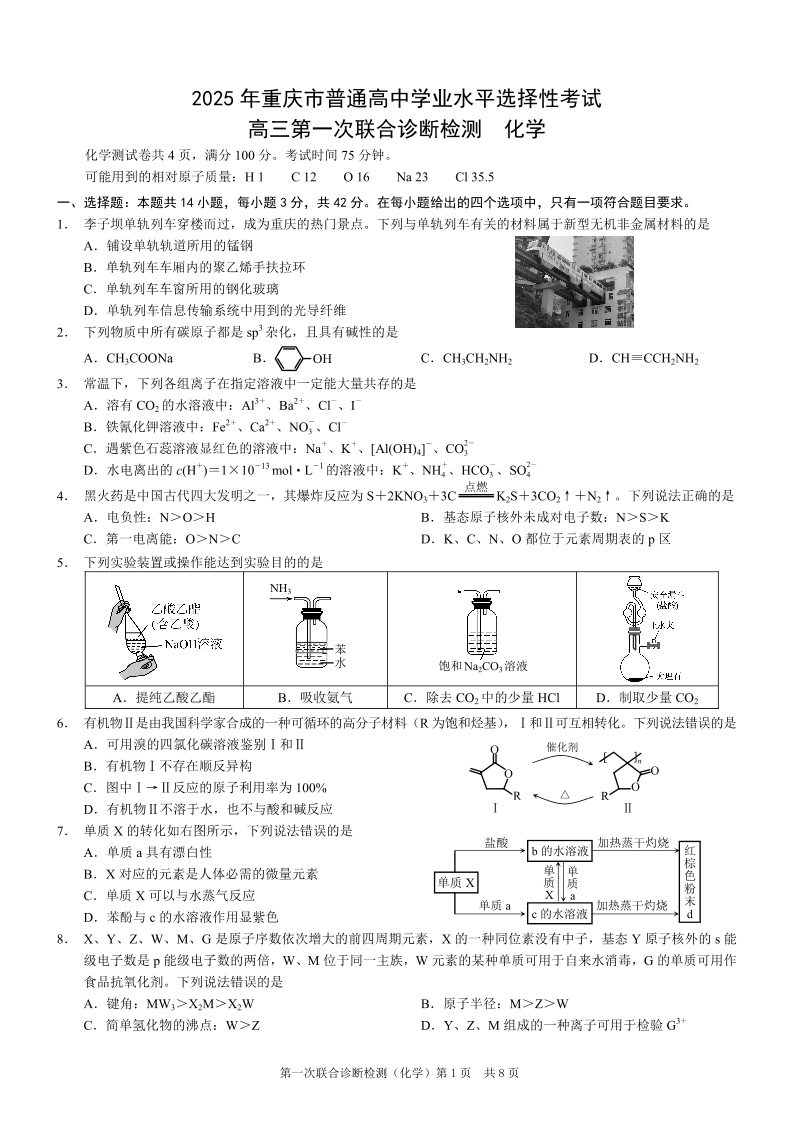 重庆市康德卷2024-2025学年上期高三第一次联合诊断(重庆一诊)化学