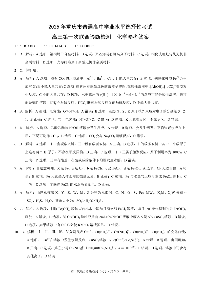 重庆市康德卷2024-2025学年上期高三第一次联合诊断(重庆一诊)化学答案