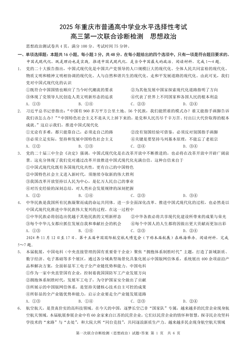 重庆市康德卷2024-2025学年上期高三第一次联合诊断(重庆一诊)政治