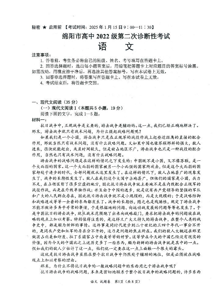 四川省绵阳市2024-2025学年上期高三第二次诊断性考试语文