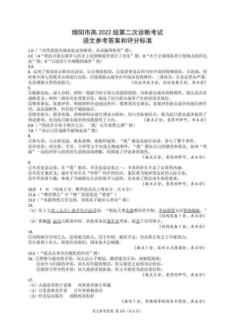 四川省绵阳市2024-2025学年上期高三第二次诊断性考试语文答案